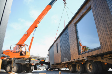 Модули шириной 3 метра (длина до 12 метров) доставляются на трале с использованием крана .